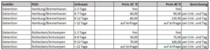 auf dieser Seite veröffentlichen wir die aktuellen Regelsätze zu Demurrage und Detention an den Häfen Rotterdam, Antwerpen, Bremerhaven und Hamburg in EUR. Storagegebühren sind in der Demurrage enthalten. Die u.g. sind für Standardcontainer ab dem 01.05.2023 gültig. Reefer, Special Equipment und Gefahrgut sind abweichend von u.g. Regelsätzen und werden nach Auslage belastet.