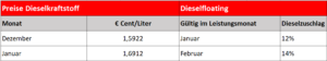 Zusammensetzung des Verbraucherpreises für Dieselkraftstoff: Basiswert des Dieselfloaters ist der durchschnittliche Literpreis EUR 1,00. Bis zum Erreichen dieses Ausgangsbetrages ist der Dieselzuschlag 0,0 Prozent.