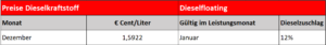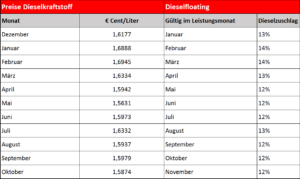Calculation of the consumer price for diesel fuel: The base value of the diesel floater is the average price per litre of EUR 1.00. Until this base value is reached, the diesel surcharge is 0.0 percent.