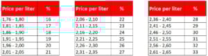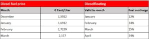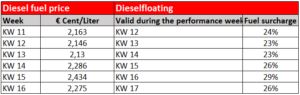 Composition of the consumer price for diesel fuel: The base value of the diesel floater is the average price per liter of EUR 1.00. Until this starting amount is reached, the diesel surcharge is 0.0 percent.