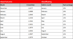 Composition of the consumer price for diesel fuel: The base value of the diesel floater is the average price per liter of EUR 1.00. Until this starting amount is reached, the diesel surcharge is 0.0 percent.